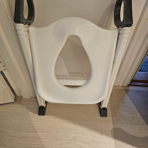 Sædet er lavet i blank plast i ét stykke, hvilket gør det både hygiejnisk og let at rengøre. Det har skridsikre fødder, så det ligger stabilt ovenpå toilettet og ikke rutsjer rundt.