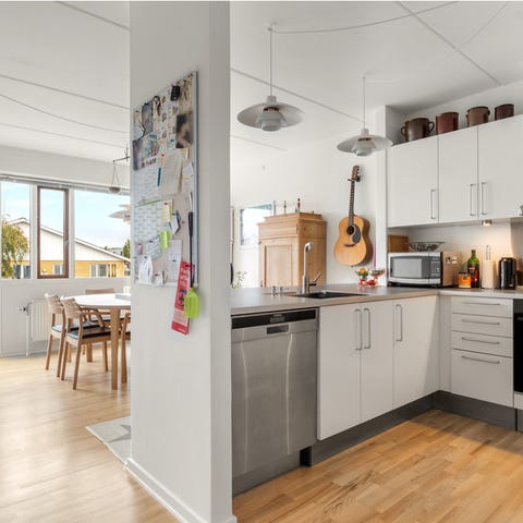 Måler 300 cm i længden på køkkensiden.