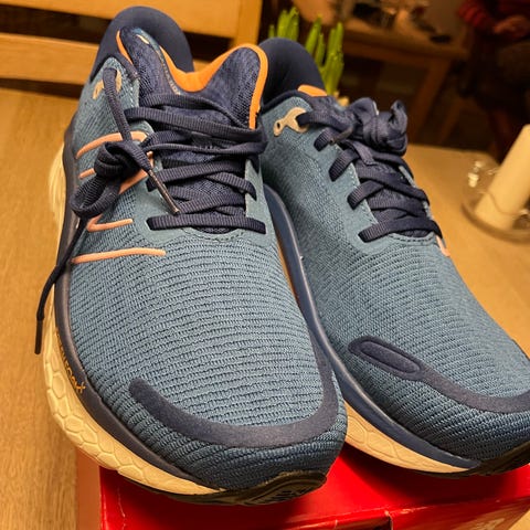 New Balance MTNTRLB5 løbesko i størrelse 43. Modellen er designet til løb og har overdel i blå tekstil/mesh med syntetiske forstærkninger. Skoen har snørelukning, polstret hælkappe og mellemsål med støddæmpning. Ydersålen har mønster, der giver greb på underlaget. Velegnet til løb og anden træning udendørs.