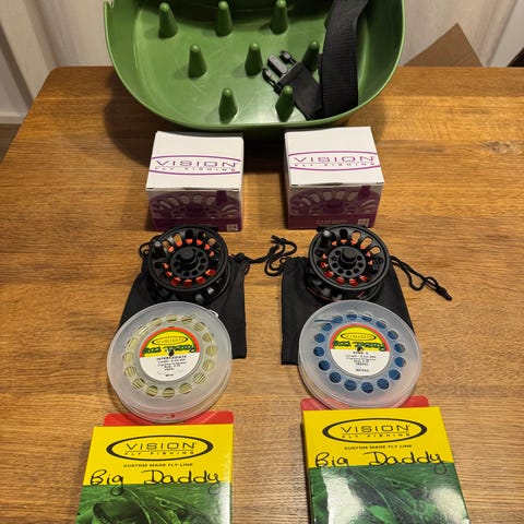 Nyt og ubrugt Vision Deep fluehjul. Hjulet har stor spole med høj kapacitet og centerbremse. Leveres med Vision-stofpose til opbevaring. klasse 7-8 alu hjul inkl backing. Pris 350kr pr stk. (jeg har to til salg). Kan sendes plus fragt.
