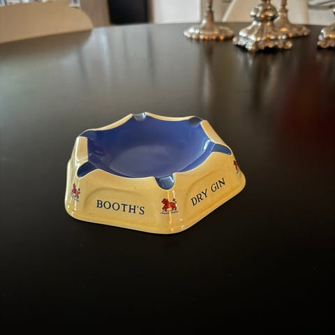 Askebægeret har lille kantudskæring til cigaretter i hver ende. Overfladen er struktureret og fremstår i gylden messingfarve. Velegnet som brugsting eller som dekorativt objekt i hjemmet.