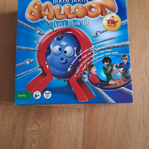 Spin Master Boom Boom Balloon familiespil. Spillet består af en rød plastikramme, pinde og balloner, hvor spillerne skiftes til at trykke pinde ind mod ballonen, indtil den springer. Egnet som familiespil fra ca. 8 år og op, for 2 eller flere spillere.