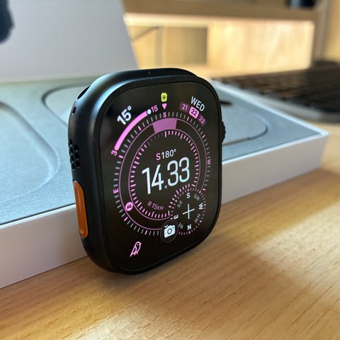 Apple Watch Ultra 2 smartwatch med 49 mm urkasse i sølvfarvet metal.