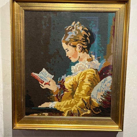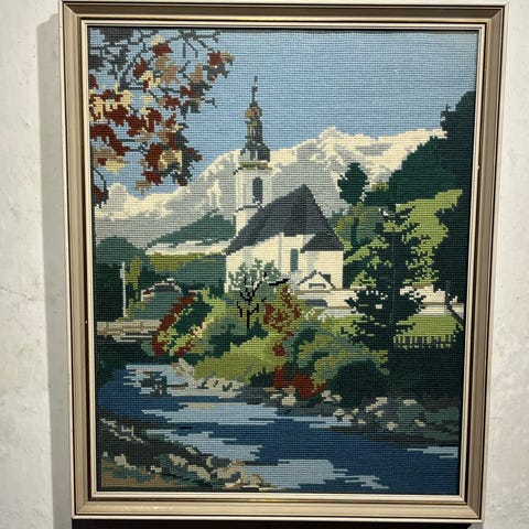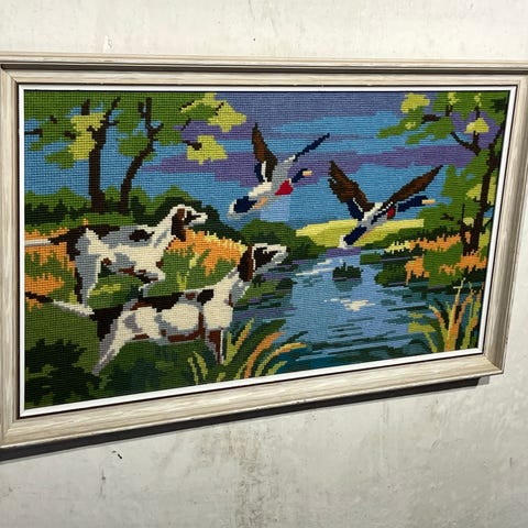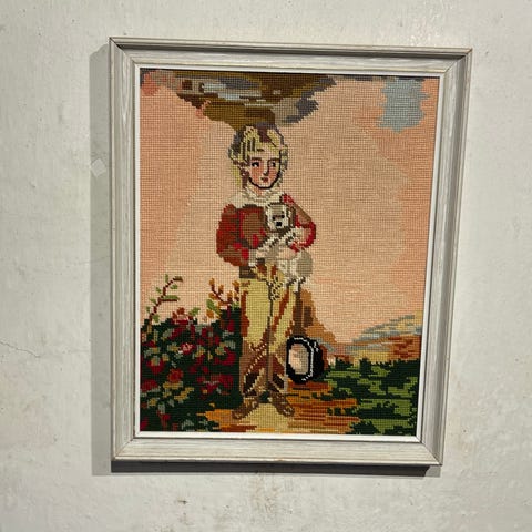 🖼️ Billede broderet stramaj korssting med ramme. Ældre, håndbroderet billede, sandsynligvis fra 1950'erne eller 1960'erne, der skildrer et hyggeligt motiv. Billedet er udført med korssting / stramajbroderi, monteret i en klassisk træramme med glas. Kunsthåndværk som har været almindelig i danske hjem, men som nu er blevet vintage. Måske kan du bruge selve broderiet til noget kreativt, en taske, en jakke, vest, pude, eller andet krea-projekt.