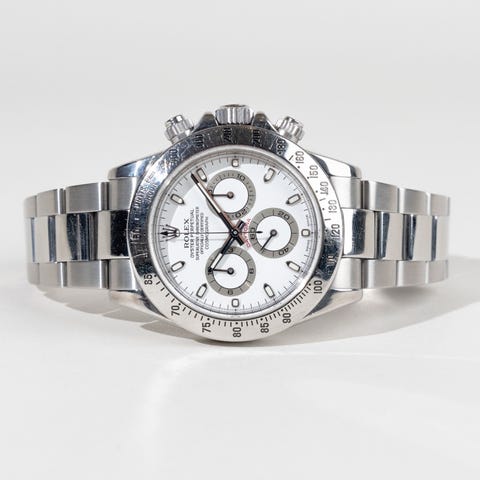 Den rene hvide skive med kontrasterende subdials og tachymeterskala på lynetten giver uret et skarpt og teknisk udtryk, mens det automatiske in-house kaliber sikrer præcision på højeste niveau. Oyster-lænken og den solide kasse fuldender et design, der både er robust og raffineret.