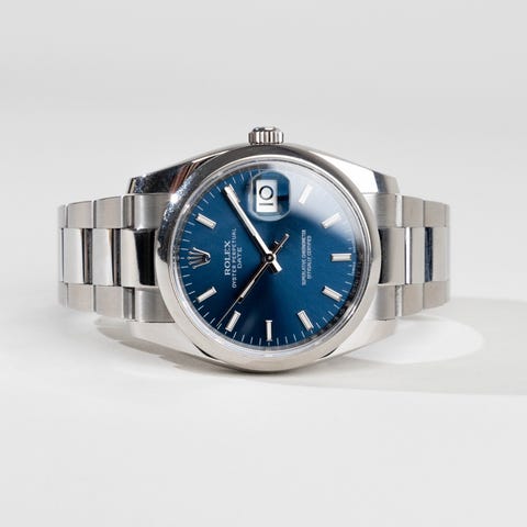 En klassisk og alsidig Rolex med et rent, tidløst design. Den smukke blå sunburst-skive giver et elegant spil i lyset og står skarpt mod den polerede stålkasse og den ikoniske Oyster-lænke.