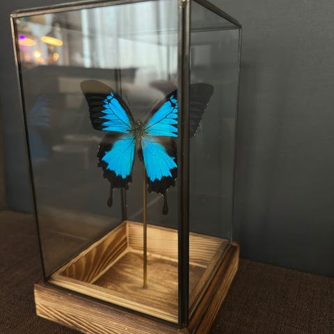 To store agt Morpho didius to store Peru under a glass globe with a black wooden base, 30 cm høj, 20 cm bred, 20 cm dyb, 450 g, år 2023, CITES- relevans: Espèces non-CITES, i god stand. Klik på den blå "gå til varen" knap, for at købe eller byde på denne vare. Den samlede pris vil blive vist inden du afgiver dit bud.
