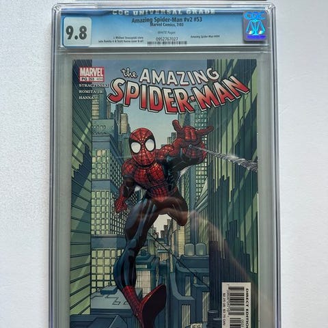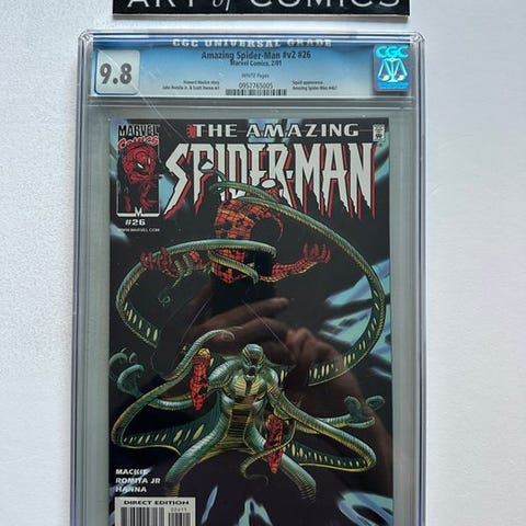 The Amazing Spider-Man Vol. 6 Nr. 25, første udgave, graderet CGC 9.8, mint tilstand, udgivet af Marvel Comics på engelsk, med kunst af John Romita Jr., Scott Hanna, Kaare Andrews, Alvaro Lopez og Zeb Wells. Klik på den blå "gå til varen" knap, for at købe eller byde på denne vare. Den samlede pris vil blive vist inden du afgiver dit bud.