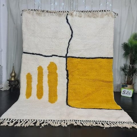 Omfavn den tidløse elegance af et håndlavet tæppe med den ikoniske Beni Ourain-stil, kendt for sine enkle geometriske mønstre og naturlige farvepalet. Dette alsidige gulvtæppe tilføjer varme og sofistikering til ethvert rum, og blander sig uden besvær med både moderne og