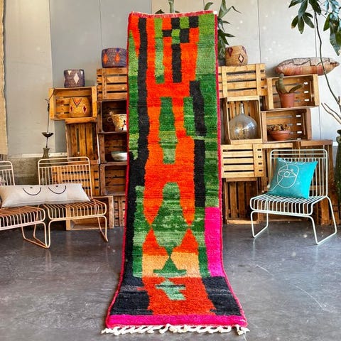 Denne autentiske marokkanske Boujad-tæppe er et nyhåndvævet stykke skabt af erfarne håndværkere fra Boujad-regionen i den Midterste Højskråning i Marokko. Boujad-tæpper værdsættes højt for deres kunstneriske frihed, symbolske motiver og udtryksfulde farvekombinationer, hvilket gør hvert tæppe til en ægte enestående creation.