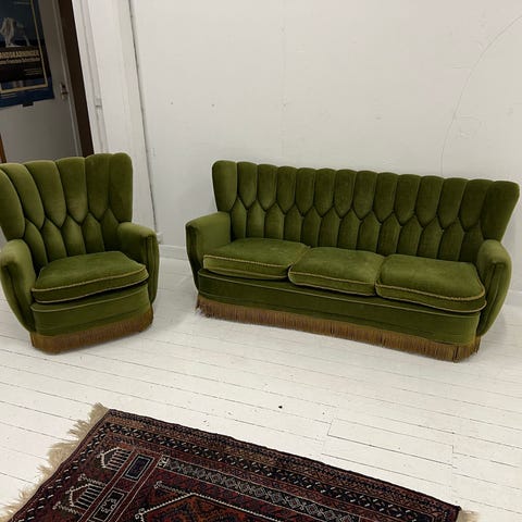Original italiensk tre-personers sofa fra 1940’erne, kendetegnet ved bløde og elegante linjer, typiske for overgangsperioden mellem sen Art Déco og tidligt modernistisk design.