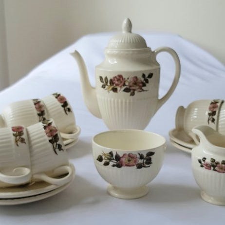 Sæt af 4 kaffekopper på fod og 2 tekopper fra det kendte Wedgwood Edme-service. Alle genstande er i meget god stand, uden chips eller sprækker.