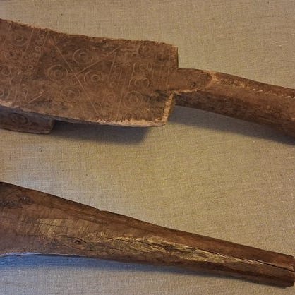 Høvdingens stav og spådomsværktøj Skulderstav "Khuluor" udhugget med hornbill-næb og en forfaderfigur.