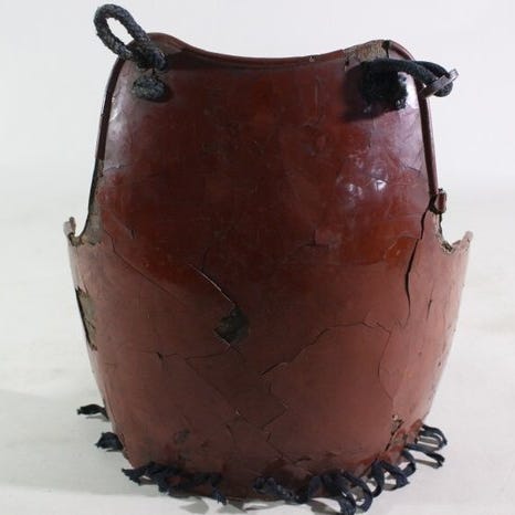 Et støbt jern Kusazuri fra Edo-perioden i Japan, over 200 år gammel, lakeret sort med en gylden familie-mønster, i rimelig stand med enkelte manglende dele, vægt 2,9 kg. Klik på den blå "gå til varen" knap, for at købe eller byde på denne vare. Den samlede pris vil blive vist inden du afgiver dit bud.