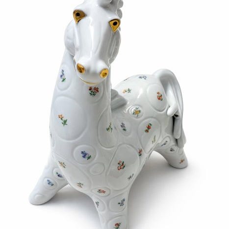 Skulpturen er lavet af keramik og har en blank finish.