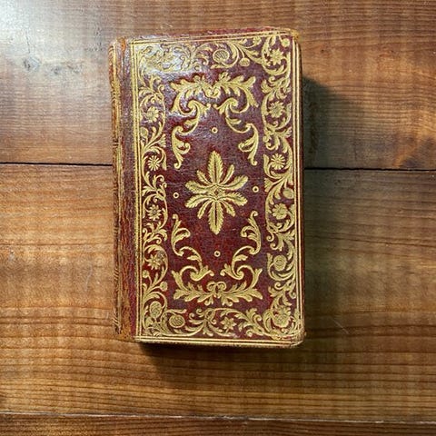 Smuk fransk læderbinding i fuldt marokkansk skind med 'en fleur de lys' i takt med teksten. Guldornamenter og rammer på forsiden og ryggen. Kanterne også forgyldte.