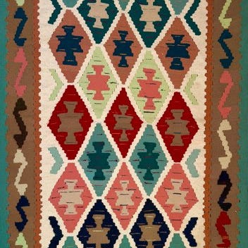 Oprindelsesland Türkiye, Model Bergama; håndvævet Cecim Chuval Kelim i uld på uld, 120 cm × 30 cm, flerfarvet, fra begyndelsen af det 20. århundrede, generelt i god stand og professionelt renset. Klik på den blå "gå til varen" knap, for at købe eller byde på denne vare. Den samlede pris vil blive vist inden du afgiver dit bud.
