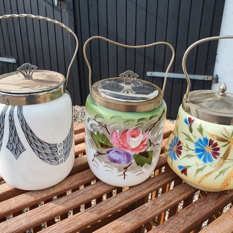 Kiksespande, opaline/fajance, 100 år gl., 6 rigtig flotte kiksepande - der er både i opaline og fajance. 2 meget gamle engelske.