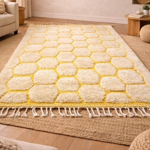 Det bløde elfenbenshvide uldtæppe er udsmykket med et subtilt diamantmønster, et traditionelt Berber-symbol der står for beskyttelse, harmoni og samhørighed. Den neutrale farve passer ind i enhver indretning, fra boheme til skandinavisk eller moderne design. Dette tæppe er håndvævet af håndværkere.