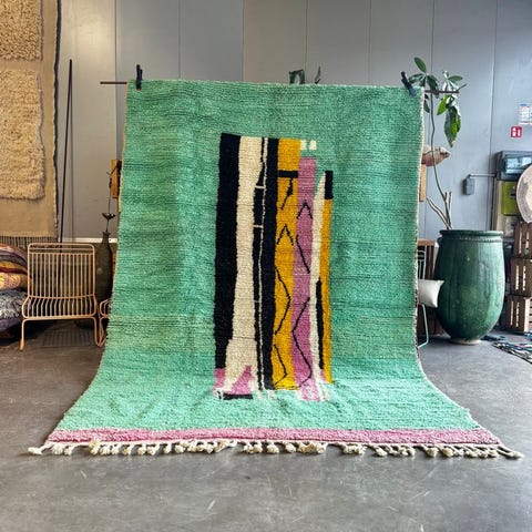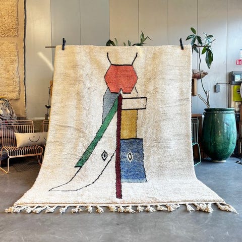 Denne nutidige marokkanske Boujad-tæppe er et nyhåndlavet stykke, vævet efter traditionelle berber-teknikker og gendigtet gennem en modig, moderne æstetik.