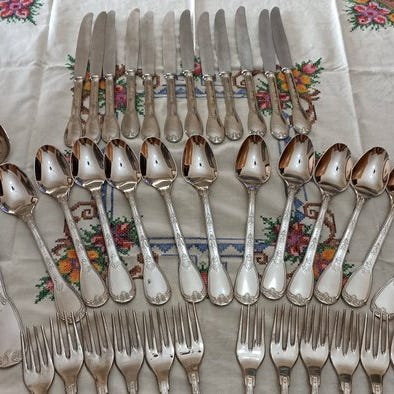 Elegant service til 12 personer, med klassisk raffineret mønster på håndtagene, præsenteret i sit oprindelige etui.
