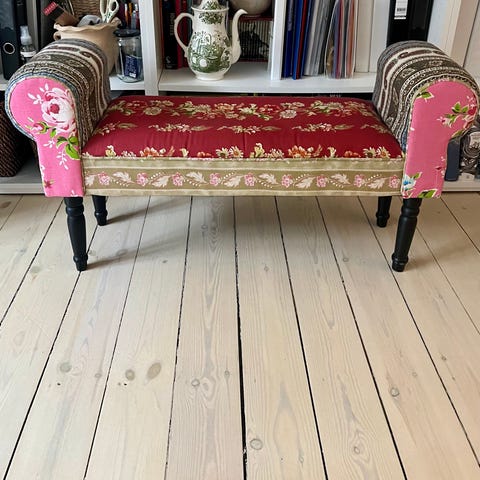 Bænken har de smukkeste afrundede markante fødder, rundede hjørner, skuffe og rum under sædet.