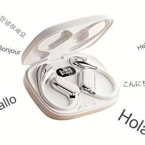 AI Intelligent Translation Headset er trådløse open-ear høretelefoner med realtidsoversættelse på op til 144 sprog. De har let og ergonomisk design for høj komfort, intelligent støjreduktion og HiFi-lydkvalitet med klar og fyldig lyd. Med touch-kontrol, digital batterivisning og op til 36 timers batteritid er de kompatible med både iOS og Android – perfekte til rejser, arbejde og daglig brug. Med op til 7 timers afspilningstid på en enkelt opladning og et medfølgende opladningsetui på 300 mAh, der muliggør flere fulde opladninger, får du pålidelig drift hele dagen. Hvert earbud har et 35 mAh batteri, der oplades hurtigt og effektivt via det kompakte USB-C-etui. Intuitive berøringskontroller giver nem adgang til musikstyring, skift mellem lydtilstande (Normal, ANC, Gennemsigtighed), opkaldsstyring og aktivering af stemmeassistenten Siri. Funktionen master-slave-skift gør det muligt at bruge enten et enkelt earbud eller begge efter behov.