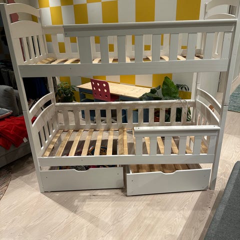 MANAYA køjeseng i hvid. Køjesengen består af to sengelejer placeret over hinanden med integreret stige + en udtræksseng og 2 skuffer til opbevaring og en sengehest.