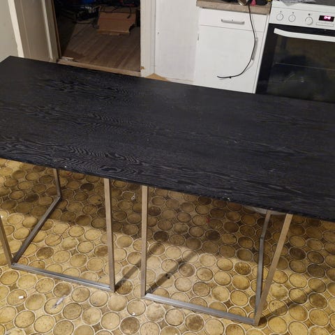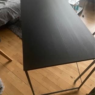 Sort rektangulært skrivebord med glat bordplade og enkle ben. Velegnet som arbejdsbord eller computerbord i kontor, studie eller hjemmemiljø. Bordet har god dybde og bredde, som giver plads til skærm, tastatur og øvrigt arbejdsudstyr.