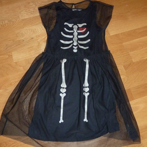 kostume til børn. Unisex model i sort bomuld med skeletmotiv på overdelen. Dragten har lange ærmer og lang benlængde. Der medfølger et par sorte handsker med skeletprint samt et par ensfarvede sorte handsker. Egnet som udklædning til fx fastelavn eller halloween.