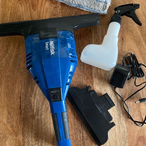 Nilfisk Smart vinduesvasker i blå. Elektrisk vinduesrenser egnet til rengøring af vinduer og glatte overflader. Håndholdt model med integreret sugefunktion, der opsamler vand under brug. Leveres med oplader som vist på billederne.
