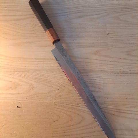 Super flot håndsmedet ukrainsk Yanagiba / Slicer / forskærerkniv med Micarta skæfte, ubrugt.