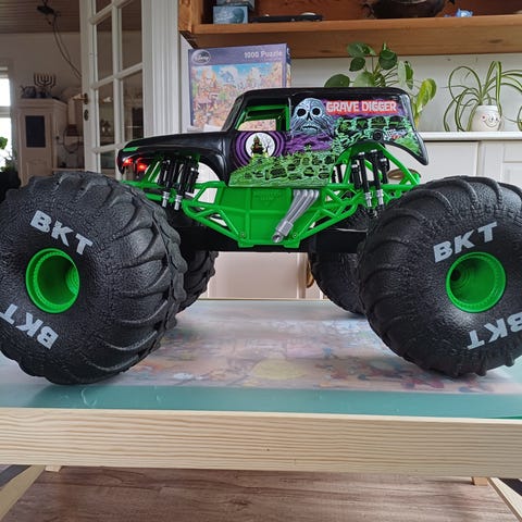 Fjernstyret monstertruck legetøjsbil i rød plast med store skumhjul. Bilen styres med medfølgende rød fjernbetjening. Egnet til lejlighed og lign. Da den ikke genererer støj