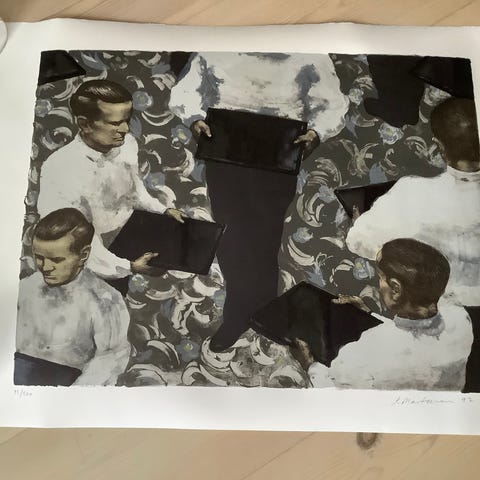 Peter Martensen, f. 1953, olie på lærred. Betitlet "9 Klovner"