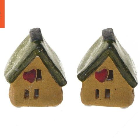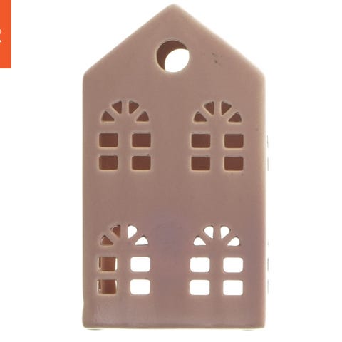 To små keramikhuse, der fungerer som dekorative lysestager. Husene har en rød ydervæg med et tekstureret design og et brunt tag. Størrelsen på husene er 9x10x7,5 cm. Lysene er placeret i bunden af husene, og der er åbninger, der tillader lyset at skinne igennem.