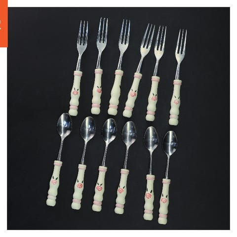 To dekorative gafler i træ med udskårne detaljer. Den ene gaffel er 24,5 cm lang, og den anden er 27,5 cm lang. De har et vintage look og kan bruges som dekoration i hjemmet.