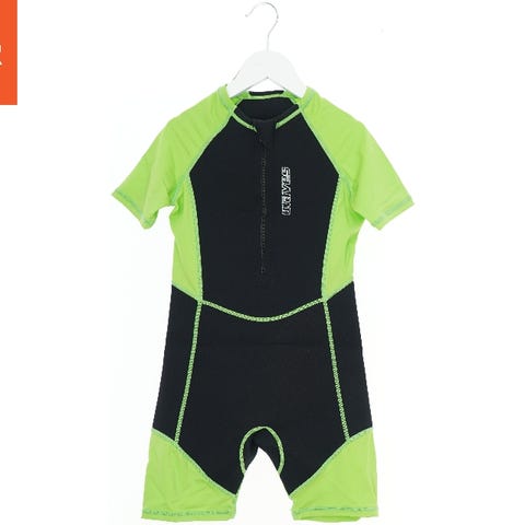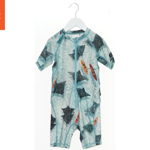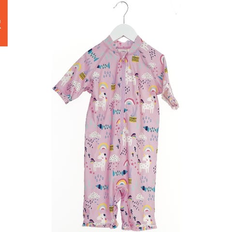 UV-kjole til børn med 3/4 ærmer og lynlåslukning foran. Dragten har et flerfarvet mønster af lyserøde søstjerner og farverige fisk på en hvid baggrund. Den er velegnet til brug i vandet og kan beskytte mod solen. Dragten har en sort ribkant ved halsen.