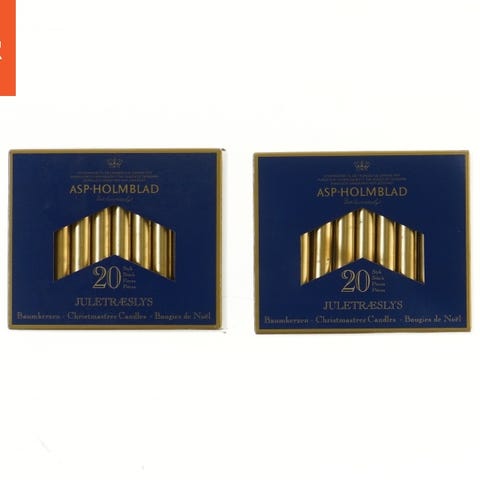 To pakker med juletræslys fra Asp-Holmblad, hver indeholdende 20 stykker, i guld farve. Lysene er beregnet til juletræer og har en højde på 11 cm. Pakkerne viser produktets detaljer og sikkerhedsinformationer.