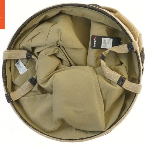 En rund, foldbar opbevaringskurv med en diameter på 40 cm. Kurven har et beige farvet stof med sorte striber og indvendige håndtag. Den er designet til at opbevare og organisere forskellige genstande let og effektivt. Kurven er let og kan nemt foldes sammen for opbevaring, når den ikke er i brug. Den leveres med en etiket fra 'Hopop'.