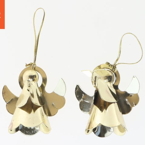 To små engleformede lysestager designet til at holde fyrfadslys. De har en guldfarvet finish og er dekoreret med vinger. Begge stager er cirka 11 cm høje og fremstillet med en åbning i bunden til lys. Tags: engle, lysestager, dekoration