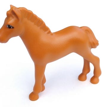 Hest, som tilbehør til dukker og rolleleg. Står selvstændigt på gulvet.