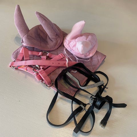 Hest med sadel, hovedtøj, tøjler og to gamacher