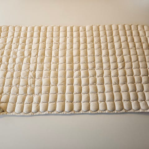 Lækkert økologisk legetæppe i størrelsen 100 x 100 cm. Er omtrent samme tykkelse som deres rullemadrasser men med et blødere stof og en fin brun kant.