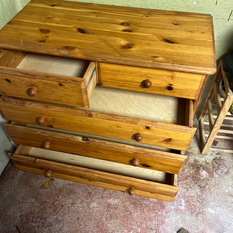 Lækker stor robust kommode lavet af min morfar for mange år siden. Den er rigtig rummelig og har været brugt flittigt af os til både opbevaring af håndklæder og en masse andet. Vi har nu valgt at den skal videre fordi vi ikke har plads længere efter vi har fået en lille dreng som også fylder med div. Ting og sager. Så nu er det tid til den skal ud og gøre et andet hjem flot. Vi har selv malet den hvid i sin tid.