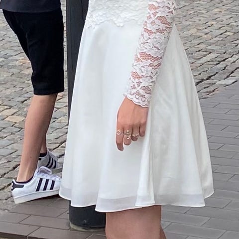 Hvid konfirmationskjole med lange ærmer. Har blonder fra livet og op. str 38.