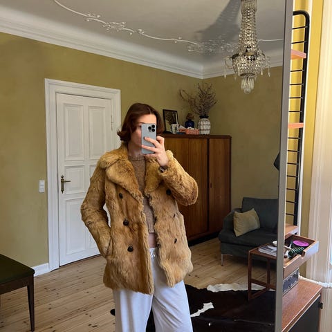 Vintage frakke i “fuskepels” til kvinder. Jakken er i str. S og har en orange/brunlig tone. Modellen er en kortere frakke med krave og lange ærmer. blødt og fyldigt udtryk. Velegnet som yderjakke i køligere vejr.