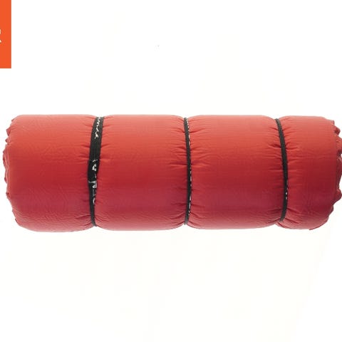 Dette oppustelige liggeunderlag er designet til camping og udendørs aktiviteter. Måtten er lysegul og lavet af slidstærkt materiale, egnet til isolering mod kold jord. Den har en ventil, der gør det let at puste måtten op og tømme den igen. Bunden af måtten har en turkis farve, og den kan nemt rulles sammen og holdes på plads med en hvid rem.