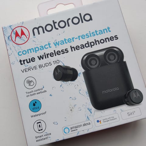 Et par Motorola øretelefoner pakket i en gennemsigtig plastpose. Øretelefonerne er sorte med en standard jackstik til tilslutning. Posen indeholder også ekstra ørepuder i sort farve, som kan udskiftes efter behov.