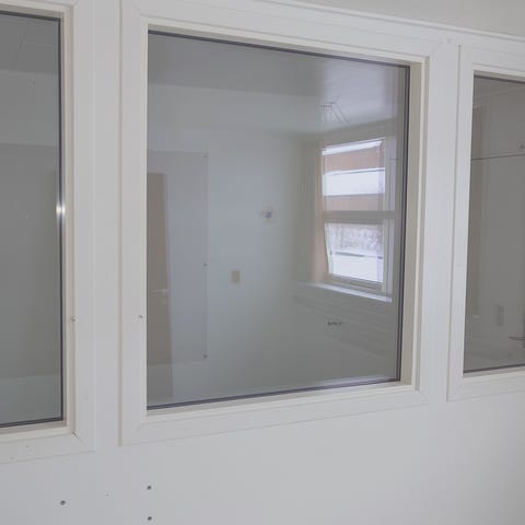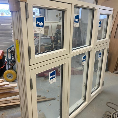 Trekantet vinduesparti i hvidt design. Vinduespartiet består af faste felter med en lodret sprosse i midten og skrå sider, der følger taghældningen. Egnet til montering over døre eller som fast glasparti i gavl eller højtsiddende vinduesløsninger, hvor der ønskes ekstra lysindfald. Farven er hvid, og rammen fremstår med en glat, moderne profil.