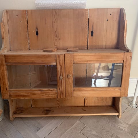 Vitrineskab afsyret til ophæng, der er en hylde og en gennemgående skuffe. Længde 98 cm, dybde 30 cm og højde 80 cm. Er i rimelig stand m. Skal afhentes.